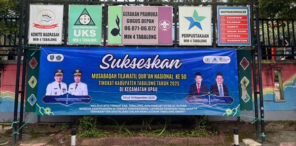 MIN 4 Tabalong – Madrasah Ibtidaiyah Negeri (MIN) 4 Tabalong turut mendukung suksesnya pelaksanaan Musabaqah Tilawatil Quran (MTQ) ke-50 tingkat Kabupaten Tabalong yang diselenggarakan di Kecamatan Upau. Dukungan tersebut diwujudkan dalam bentuk partisipasi aktif madrasah melalui pemasangan spanduk ucapan yang dipasang di depan madrasah.