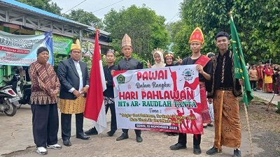 MTs Ar Raudlah Tanta - Dalam rangka memperingati Hari Pahlawan Nasional Tahun 2025, Madrasah Tsanawiyah (MTs) Ar Raudlah Tanta menggelar acara pawai hari pahlawan Senin (10/11/25) berjalan dan mengelilingi jalan desa Tanta, yang dimulai dan berakhir di halaman madrasah.