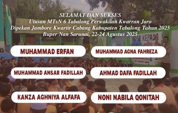 Tanjung (MTsN 6 Tabalong) Tindak lanjut dari suksesnya gelaran Jambore Ranting yang telah digelar beberapa waktu lalu, 6 siswa MTsN 6 Tabalong terpilih untuk mewakili Kwarran Jaro pada Jambore Cabang yang akan segera digelar. Berita tersebut disampaikan secara resmi oleh Sang Pelatih, Muhammad Fauzan pada Minggu (10/08/25) di sekretariat pramuka MTsN 6 Tabalong.