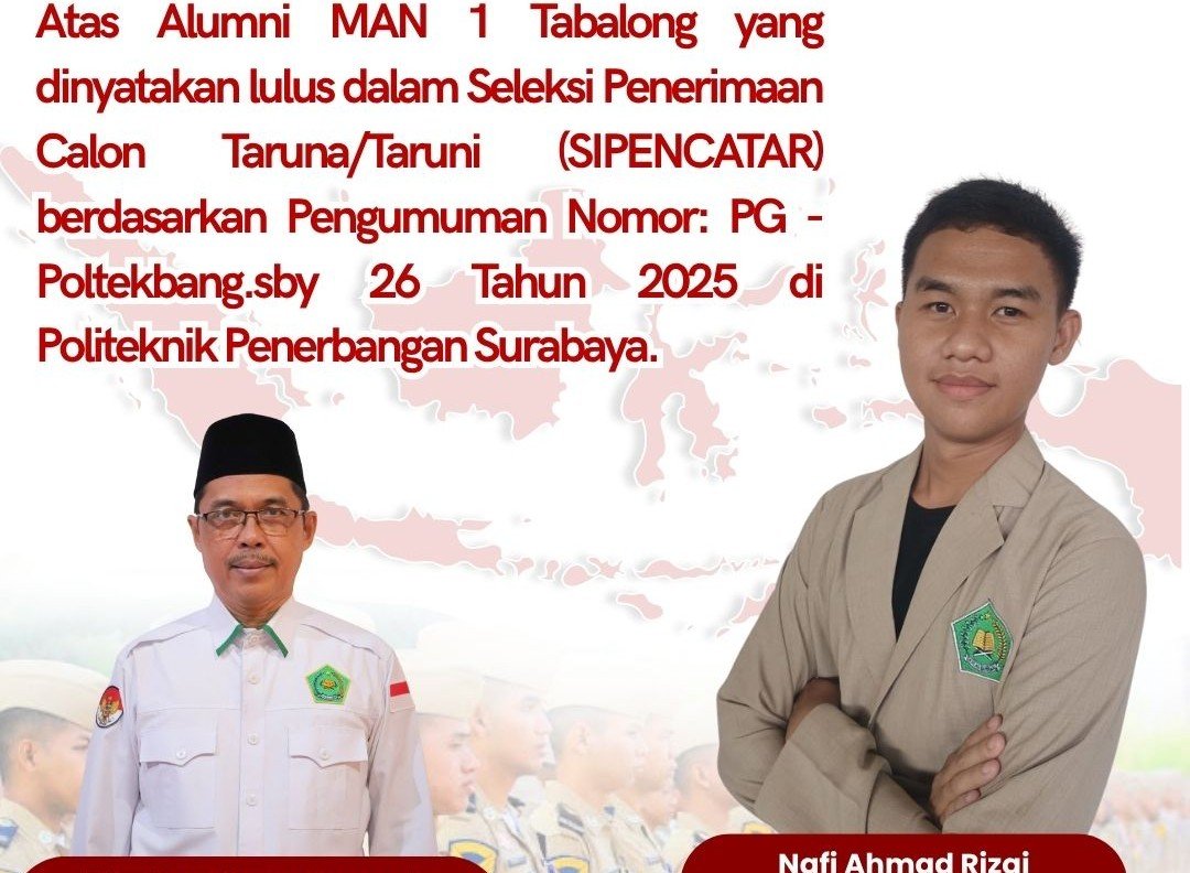 Tanjung (MAN 1 Tabalong)– Kabar membanggakan datang dari MAN 1 Tabalong. Salah satu alumninya, Nafi Ahmad Rizqi, dinyatakan lulus dalam Seleksi Penerimaan Calon Taruna/Taruni (SIPENCATAR) Politeknik Penerbangan Surabaya Tahun 2025. Ia berhasil menembus jalur D3 Teknik Navigasi Udara, sebagaimana tercantum dalam Pengumuman Nomor: PG-Poltekbang.sby 26 Tahun 2025, Minggu (03/08/25)