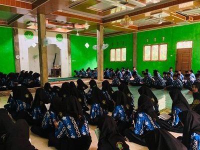 Para siswa dari kelas VII dan VIII tampak mengenakan seragam rapi dan duduk tertib sambil melafalkan dzikir dan doa-doa yang dipimpin oleh ketua Osim dan guru pembimbing. Kegiatan ini merupakan bagian dari tradisi madrasah yang rutin dilaksanakan setiap akhir semester sebagai bentuk rasa syukur dan persiapan mental menghadapi hasil belajar.