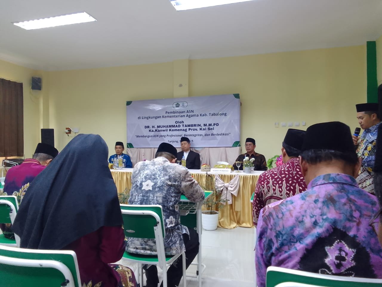 Dalam sambutannya, Dr. H. Muhammad Tambrin, M.M.Pd., menekankan pentingnya membangun ASN yang berkualitas demi pelayanan umat dan masyarakat. "Saya sangat mengapresiasi kehadiran dan antusiasme seluruh jajaran ASN Kementerian Agama di Tabalong yang hadir dalam pembinaan ini," ujar beliau. "Sesuai dengan tema kita 'Membangun ASN yang Profesional, Berintegritas, dan Berdedikasi', kami berharap setiap ASN dapat senantiasa meningkatkan profesionalisme dalam menjalankan tugas, menjaga integritas di setiap tindakan, dan menanamkan dedikasi yang tinggi untuk melayani masyarakat. Ini adalah pilar utama agar Kementerian Agama dapat memberikan pelayanan yang optimal dan meraih kepercayaan publik." tambahnya