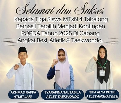 Seleksi diselenggarakan oleh Dinas Pemuda, Olah Raga dan Pariwisata (Disporapar) dalam rangka memilih atlet  yang akan mewakili Tabalong di ajang POPDA tingkat Provinsi Kalsel 15-22 Mei mendatang di Banjarmasin. Tiga siswa MTsN 4 Tabalong yang lolos pada ajang POPDA tersebut adalah Akhmad Raffa cabang Atletik lari, Syarafina Salsabila cabang Tae Kwon Do dan Sifa Alya Putri cabang angkat besi.