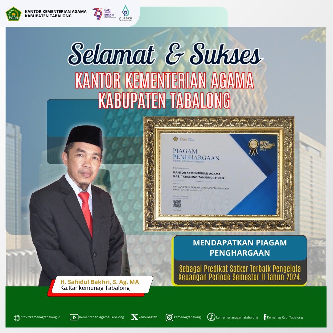 Kemenag Tabalong Raih Predikat Satker Terbaik Pengelolaan Keuangan APBN Semester II Tahun 2024 18 Mar 2025 1 tahun yang lalu 294x dibaca Kemenag Tabalong Raih Predikat Satker Terbaik Pengelolaan Keuangan APBN Semester II Tahun 2024