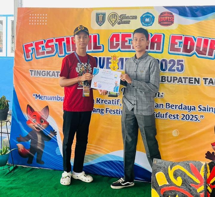 MTsN 6 Tabalong - Prestasi membanggakan kembali ditorehkan oleh salah satu anggota tim Pramuka MTsN 6 Tabalong, Muhammad Waafyy, yang berhasil meraih Juara 1 dalam Lomba Poster Hari Pahlawan 2025 pada gelaran Festival Ceria Edufest yang diselenggarakan oleh SMPN 2 Tanjung. Penyerahan trofi penghargaan dilakukan pada Sabtu (29/11/25) di SMPN 2 Tanjung dan turut dihadiri oleh pelatih Pramuka MTsN 6 Tabalong, Muhammad Fauzan, yang mendampingi Waafyy secara langsung.