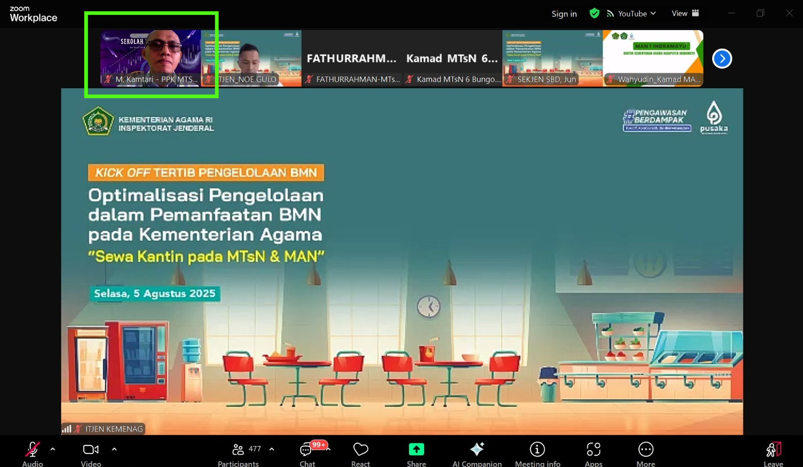 MTsN 10 Tabalong diwakili oleh Kepala Tata Usaha, H. M. Kamtari, S.S., yang mengikuti sosialisasi secara virtual bersama perwakilan satuan kerja dari seluruh Indonesia. Kegiatan ini menghadirkan dua narasumber utama, yaitu Sekretaris Itjen Kemenag, Kastolan, dan Nurul Badruttamam, yang memaparkan secara rinci pentingnya pengelolaan Barang Milik Negara (BMN) secara sah, transparan, dan sesuai regulasi, khususnya dalam pengelolaan fasilitas kantin di lingkungan madrasah.