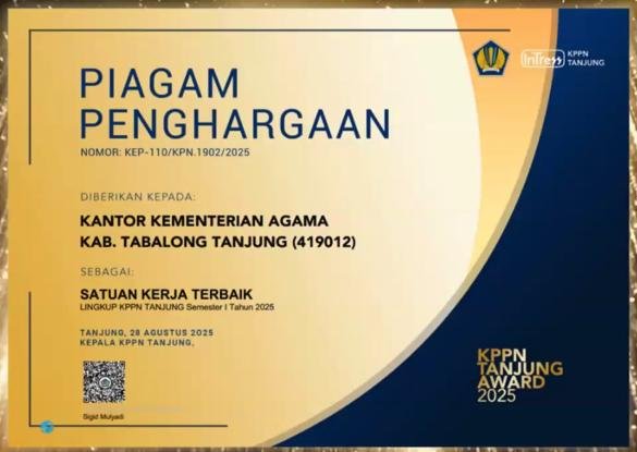 Pada kegiatan Forum Konsultasi Publik dan KPPN Tanjung Awards Semester I Tahun 2025 yang digelar secara virtual Kamis (28/8/25), Satker Setjen Kankemenag Tabalong (Kode Satker 419012) berhasil meraih predikat Satker Terbaik / Juara Umum Pengelolaan Keuangan APBN Semester I Tahun 2025 dari total 87 satuan kerja lingkup KPPN Tanjung, yang mencakup Kabupaten Tabalong, Kabupaten Balangan, dan Kabupaten Hulu Sungai Utara.